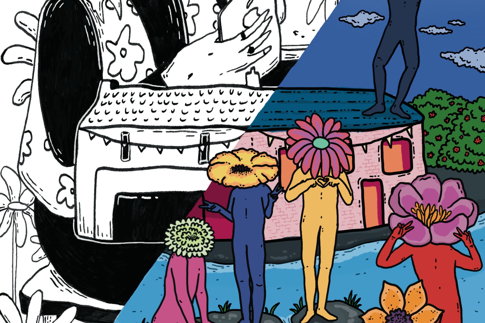 Jeanneaut, artiste platicien·ne nantais·e, pratique la narration que ce soit en peinture, en illustration numérique, en linogravure ou encore en papier mâché… Iel cherche constamment à raconter des histoires grâce à un langage visuel rempli de symboles et de références en tous genres.